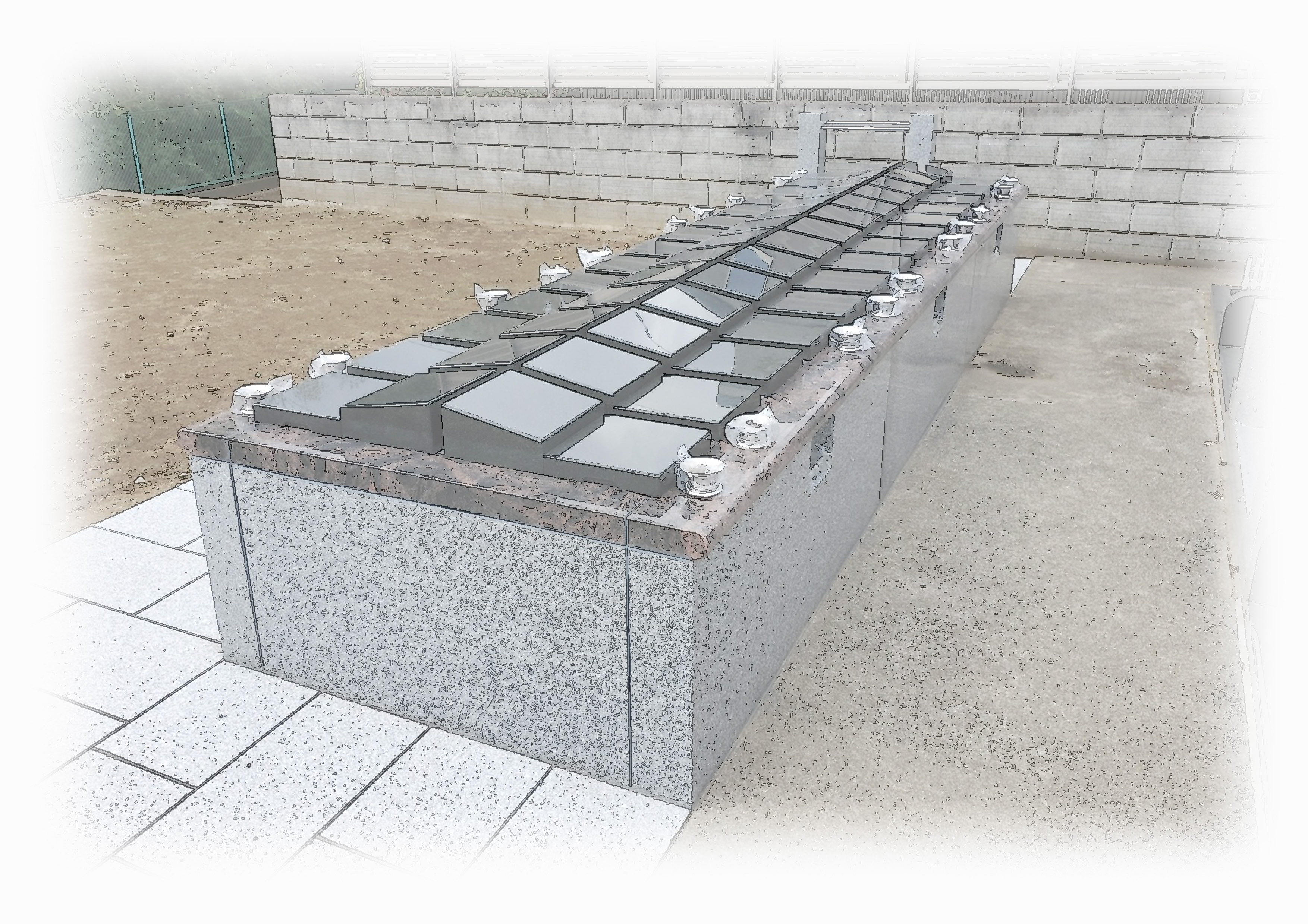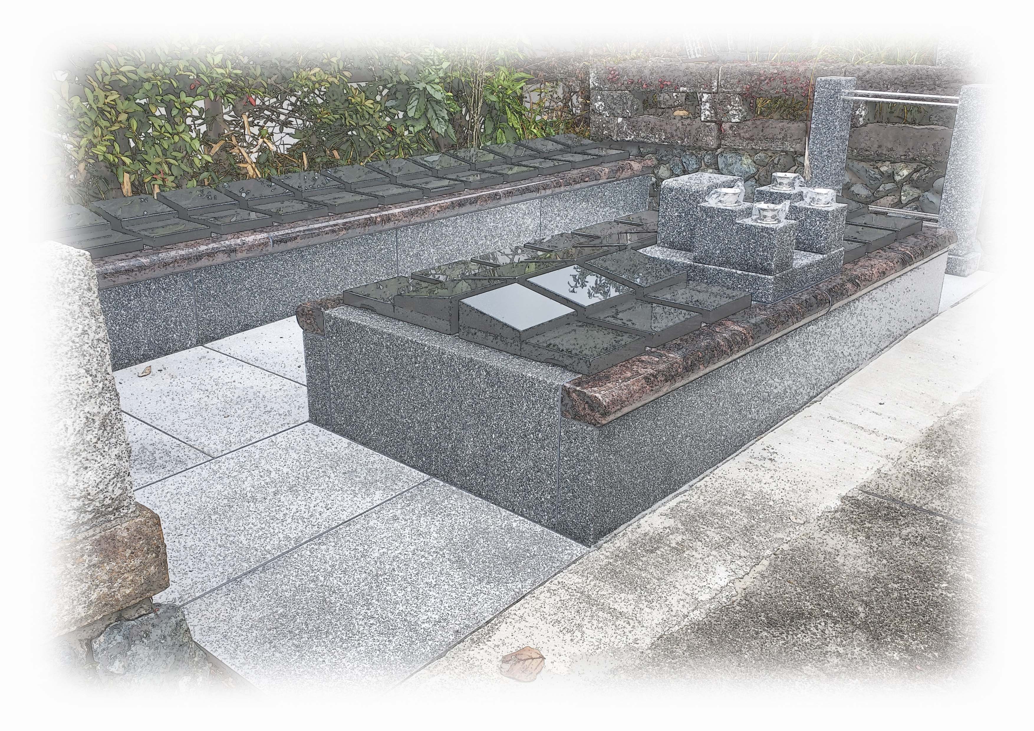 テラス葬とは一般的にお墓を地面より高い位置に設置しているものを言います。そこでお墓の土台部分を連結共有させて、石材やブロックなどで形成し上部にお墓本体が並んでいる構造となります。連結させない形状もありますが、ここでは連結しているものをご紹介いたします。